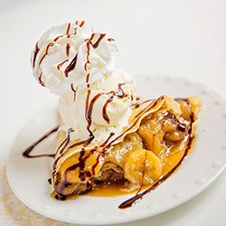 Waffle or Crêpe covered in yummy banana & cinnamon cooked in brown sugar topped with a scoop of ice cream, homemade cream Chantilly and delicious caramel sauce.