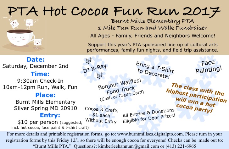 Please turn in your registration forms by this Friday 12/1 so there will be enough cocoa for everyone! Checks can be made out to: “Burnt Mills PTA.”